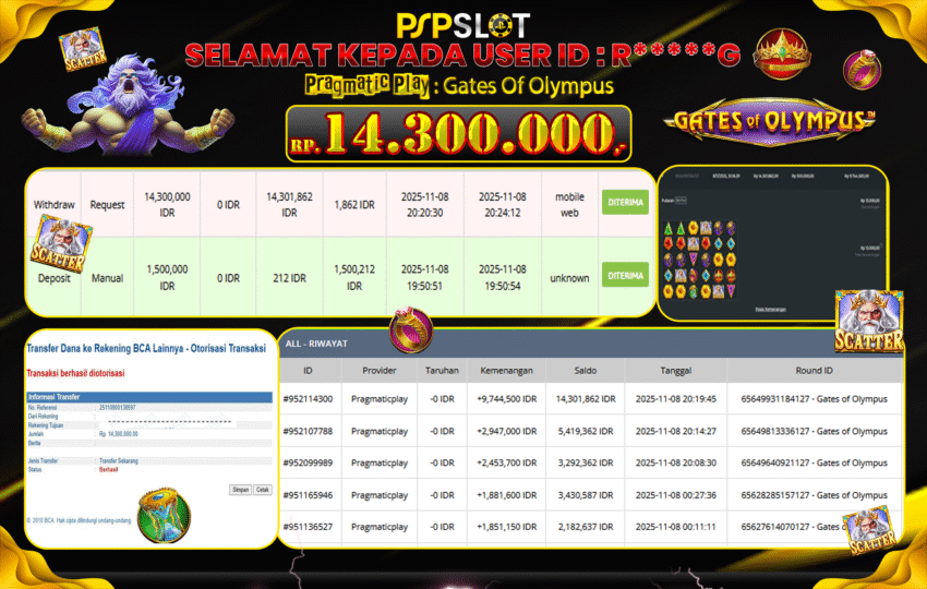 Berikut adalah bukti jackpot paus dan pembayaran kemenangan member setia PSPSLOT: