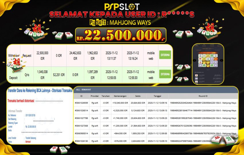 Berikut adalah bukti jackpot paus dan pembayaran kemenangan member setia PSPSLOT: